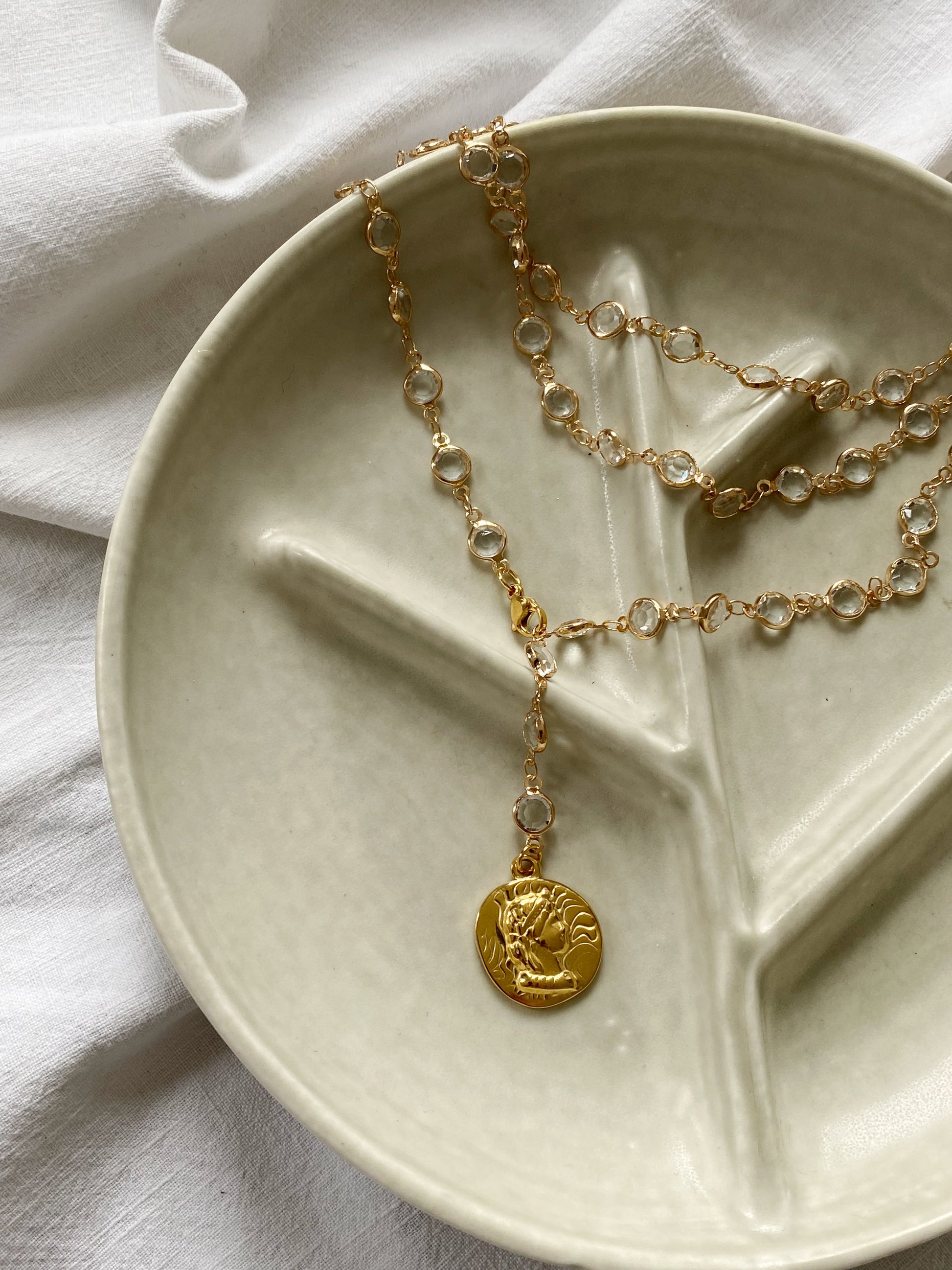 Collier en cuivre et perles de verre avec pendentif en acier inoxydable doré à l’or fin.