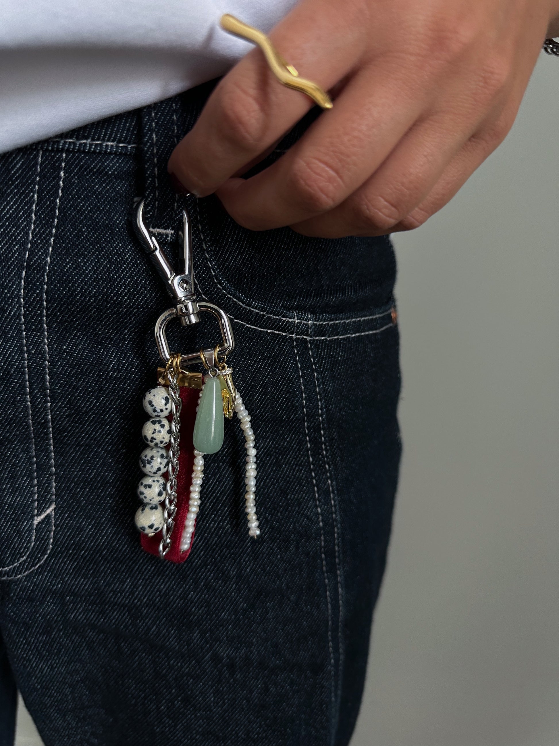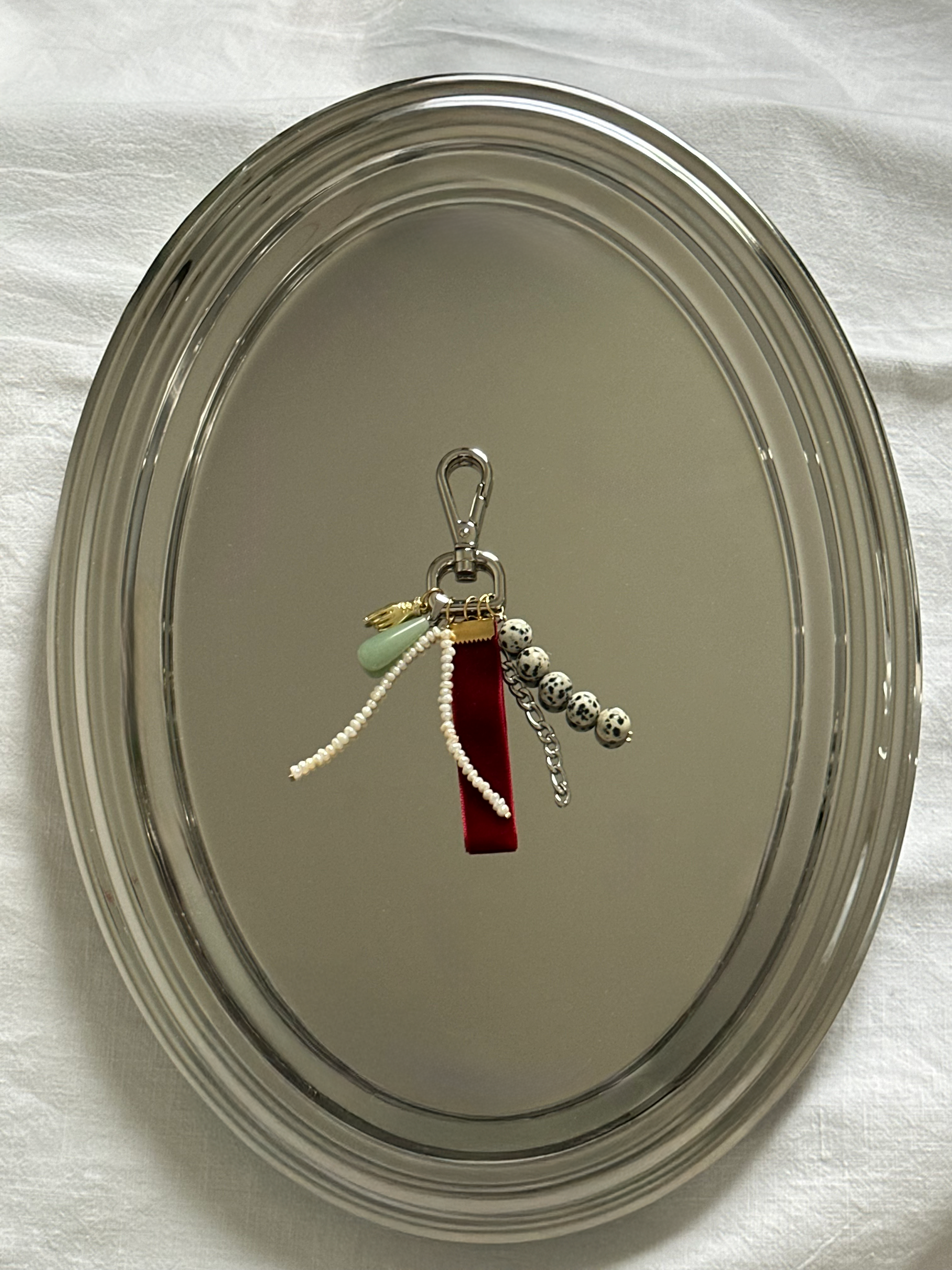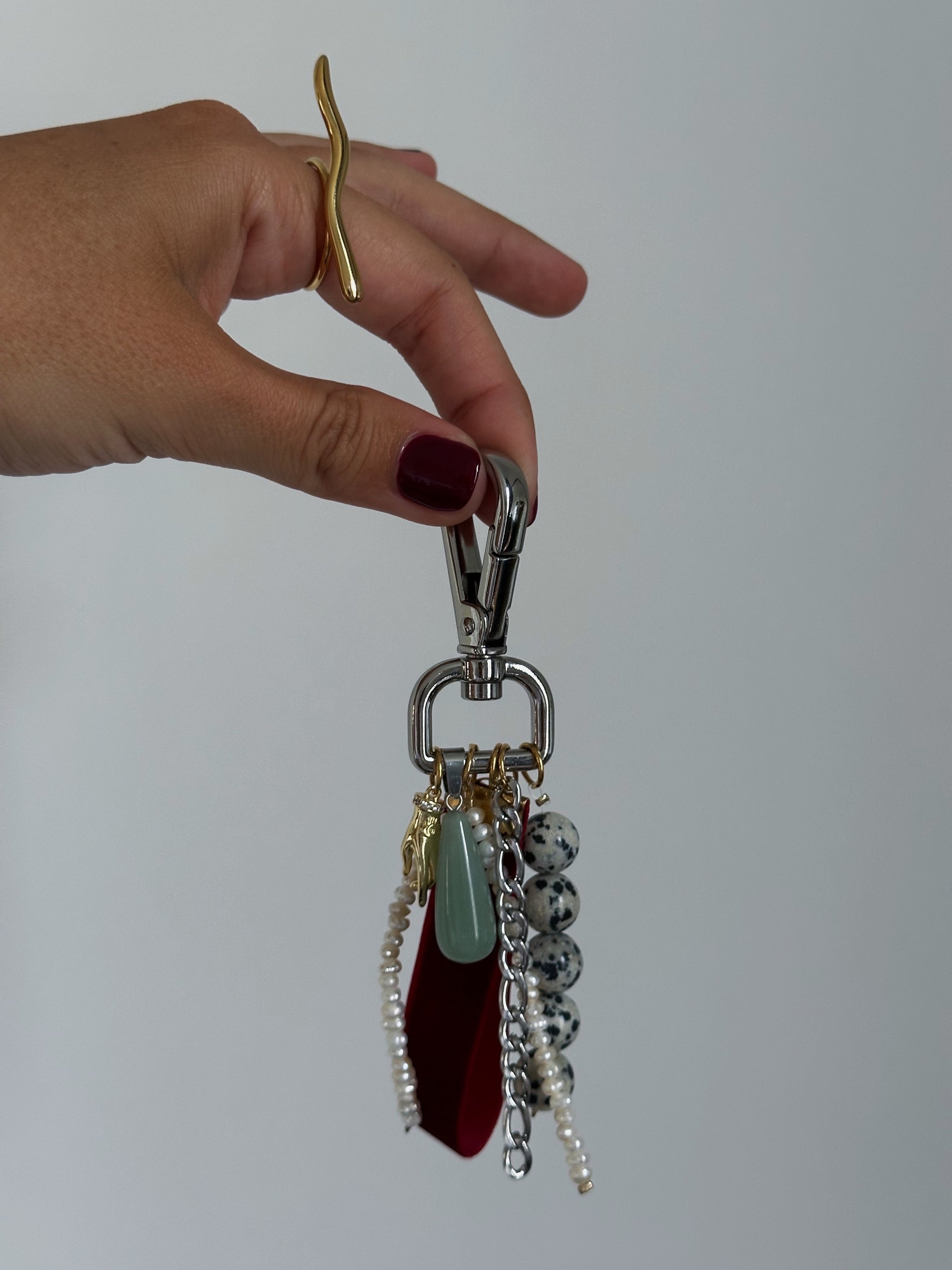 Porte-clés en acier inoxydable argenté, perles d'eau douce et velours.